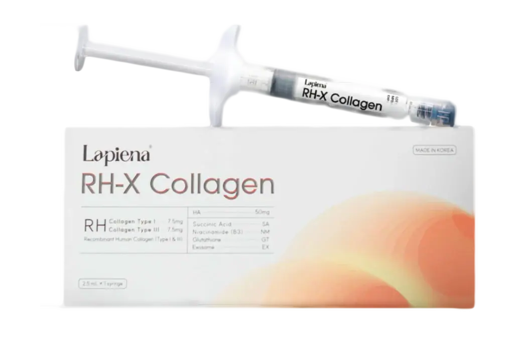 Lapiena RH-X Collagen Booster potenciador avanzado de piel que combina colágeno humano recombinante tipo I y III con exosomas de última generación, logrando una sinergia potente en la regeneración celular y el rejuvenecimiento facial.